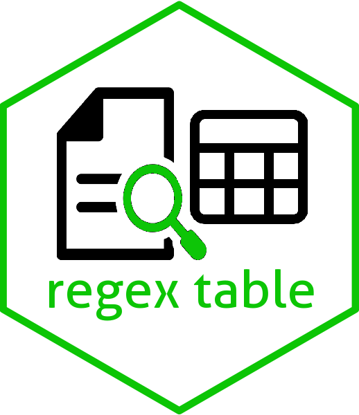 regextable extracts regex-based pattern matches from a data frame or character vector using a lookup table of regular expressions. For each input row, the first matching pattern is returned along with the matched substring, an internal row identifier, and the original input columns (or a user-specified subset). Optional metadata from the pattern table can be included, and performance on large datasets is improved by stopping the search for a row once a match is found.